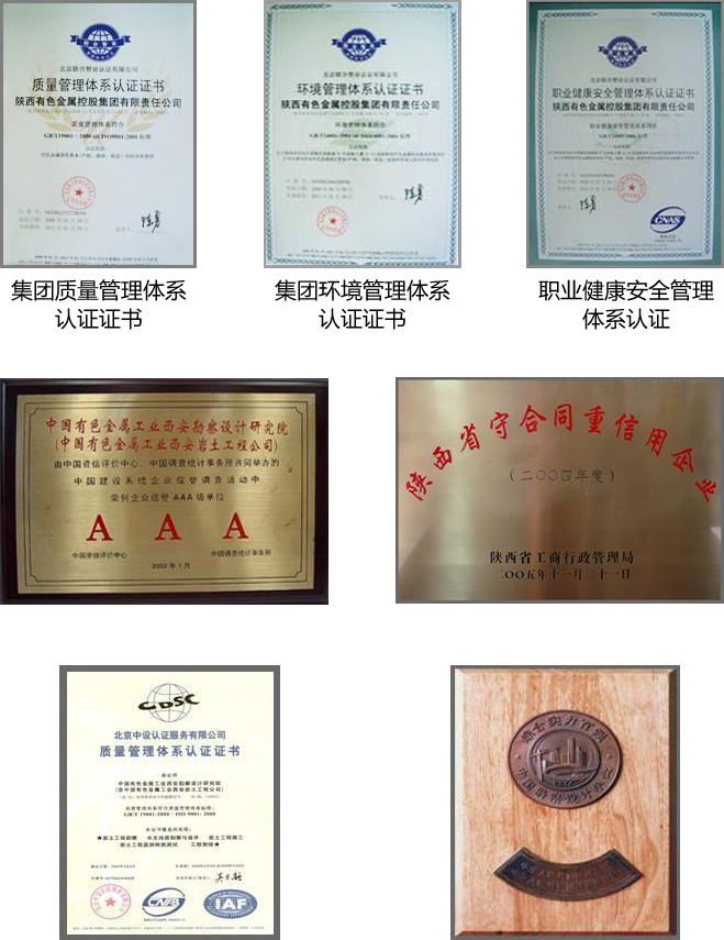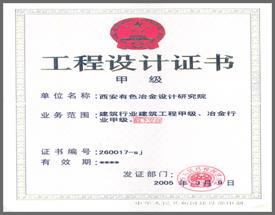 西安有色冶金設計研究院具有國家建設部、國家發(fā)改委頒發(fā)的冶金行業(yè)、建筑行業(yè)、工程咨詢、工程造價四項設計、咨詢甲級資質和城市規(guī)劃、工程監(jiān)理、壓力管道、安全評價四個乙級資質。可承擔國內外大、中型冶金、礦山工程、土木建筑工程可行性研究、初步設計、施工圖設計以及科研攻關、機電一體化、自動化技術研究,并能進行工程項目管理、工程監(jiān)理和工程承包,是《陜西省工程勘察設計行業(yè)從業(yè)公約》發(fā)起單位,通過ISO9001-2000質量管理體系、ISO14000-2004環(huán)境管理體系、OHSAS18000職業(yè)健康安全三大管理體系認證。