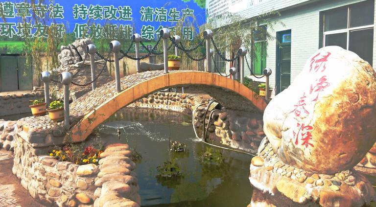 最吸引眼球的莫過于車間辦公室前面的小花池了!形色各異的石頭砌就的圍堰獨具特色,碧綠的池水上架著一座微型拱橋,廢舊物料制作的銀白色立柱、圓球形套環(huán)與黑褐色鐵鏈組成的安全護(hù)欄,一下子把小橋裝扮得韻味十足。兩塊形態(tài)獨特的文化石屹立在池水中,一塊寫著“清風(fēng)池”,另一塊寫著“綠凈春深”;水面上的噴頭如一朵小蓮花正吐露著銀色的水花;難得的暖陽灑向水面,紅色、黃色、銀白色的小金魚聞聲成群結(jié)隊地向我們游來,不時激起一圈圈漣漪?!扒屣L(fēng)池”上微風(fēng)徐來,“綠凈春深”意境悠遠(yuǎn),怎一個美字了得?不由得讓人駐足觀望,仿佛自己走進(jìn)了鬧市中公園一角。
