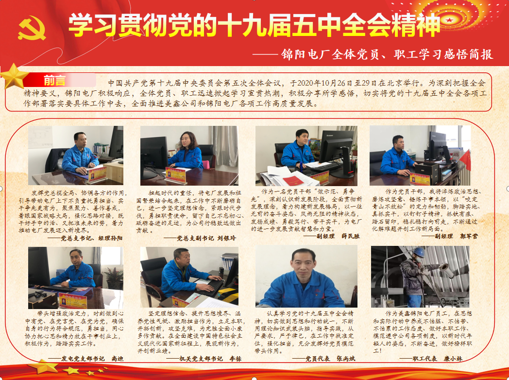 在公司宣講團(tuán)示范下,各基層單位多措并舉提高宣講實(shí)效:錦陽(yáng)電廠黨總支通過(guò)動(dòng)員部署、理論宣講、創(chuàng)辦感悟簡(jiǎn)報(bào)等形式,指導(dǎo)職工認(rèn)真學(xué)習(xí)領(lǐng)會(huì)全會(huì)精神;陽(yáng)極分公司黨總支成立宣講工作組,深入車間、班組一線,推動(dòng)學(xué)習(xí)貫徹五中全會(huì)精神向一線延伸拓展……一場(chǎng)場(chǎng)形式多樣、具體務(wù)實(shí)的宣講活動(dòng),持續(xù)推動(dòng)全會(huì)精神進(jìn)入思想進(jìn)入一線。