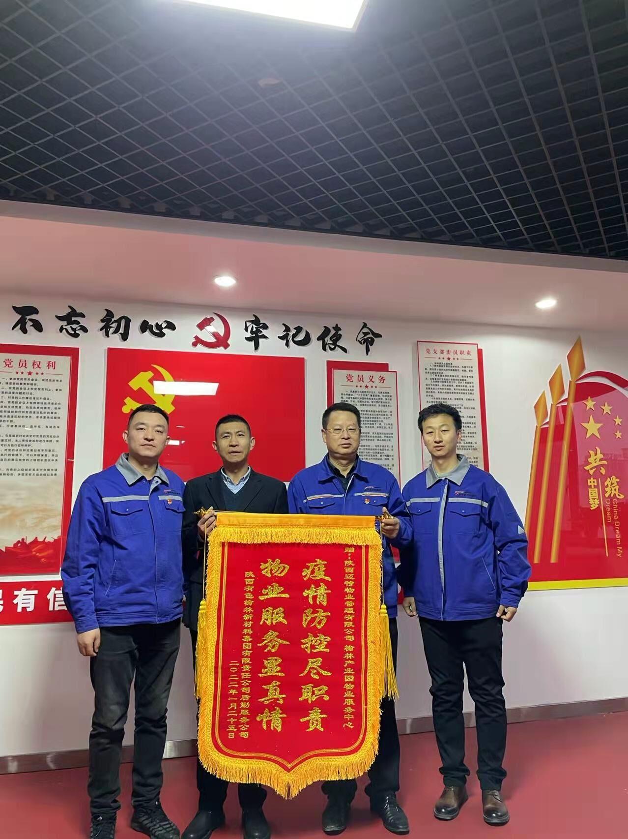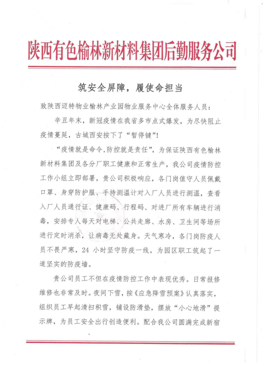 1月25日,陜西有色榆林新材料集團(tuán)后勤服務(wù)公司在黨建會議室為西安實(shí)業(yè)邁特物業(yè)公司送來一面寫有“疫情防控盡職責(zé) 物業(yè)服務(wù)顯真情”的錦旗和一封表揚(yáng)信,感謝邁特物業(yè)公司工作人員一年來細(xì)致入微,盡職盡責(zé)的貼心服務(wù)以及在抗疫期間的實(shí)干擔(dān)當(dāng)。
