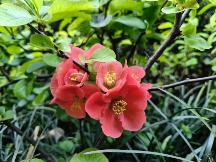 我不由自主地放慢腳步,湊近細(xì)賞,只見那貼梗而生的花朵,紅的似火,粉的如霞,有的簇?fù)硐噘?,有的?dú)自綻放。嬌嫩的花瓣層層疊疊,錯(cuò)落有致,交織出一幅幅絢爛的畫卷;花蕊恰似點(diǎn)點(diǎn)嫩黃的星辰,靈動地點(diǎn)綴其間,飄散出絲絲縷縷、若有若無的清甜香氣。微風(fēng)拂過,花枝隨風(fēng)輕擺,花朵相互輕撫,恰似跳躍的音符,在共同譜寫一曲無聲卻動人的樂章。這美妙的旋律瞬間驅(qū)散周圍的喧囂,在公司門口營造出一方充滿詩意的小天地。