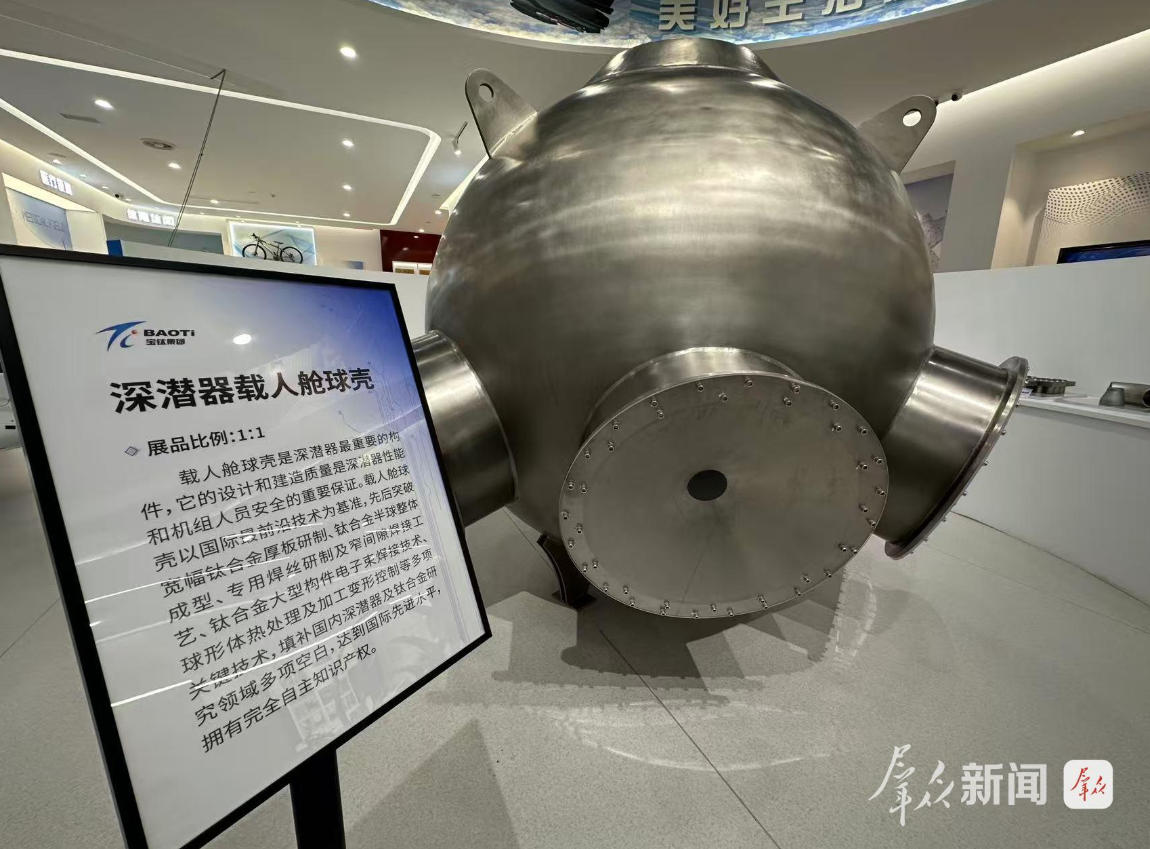 9月23日,走進寶鈦集團,展覽館內(nèi)碩大的深潛器載人艙球殼模型將時間線拉回5年前。2020年11月,裝有寶鈦研制生產(chǎn)的鈦合金載人球艙的“奮斗號”載人潛水器在馬里亞納海溝成功坐底10909米,創(chuàng)造我國載人深潛的新紀(jì)錄。
