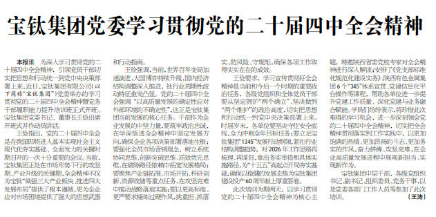 王儉要求,學(xué)習(xí)宣傳貫徹好全會精神是當(dāng)前和今后一個時期的重要政治任務(wù),各級黨組織和全體黨員干部要從堅(jiān)定擁護(hù)“兩個確立”、堅(jiān)決做到“兩個維護(hù)”的政治高度,切實(shí)把思想和行動統(tǒng)一到黨中央決策部署上來。時屆歲末,各單位要堅(jiān)決守住安全底線,全力沖刺全年目標(biāo)任務(wù);要立足寶鈦集團(tuán)“1345”發(fā)展行動綱領(lǐng),緊扣行業(yè)結(jié)構(gòu)調(diào)整趨勢,對2026年工作思路再梳理、再謀劃,拿出務(wù)實(shí)舉措和具體實(shí)施路徑,為“十五五”高起點(diǎn)開局夯實(shí)基礎(chǔ),確保以穩(wěn)健的發(fā)展態(tài)勢為寶鈦集團(tuán)建設(shè)投產(chǎn)60周年獻(xiàn)上厚重答卷。