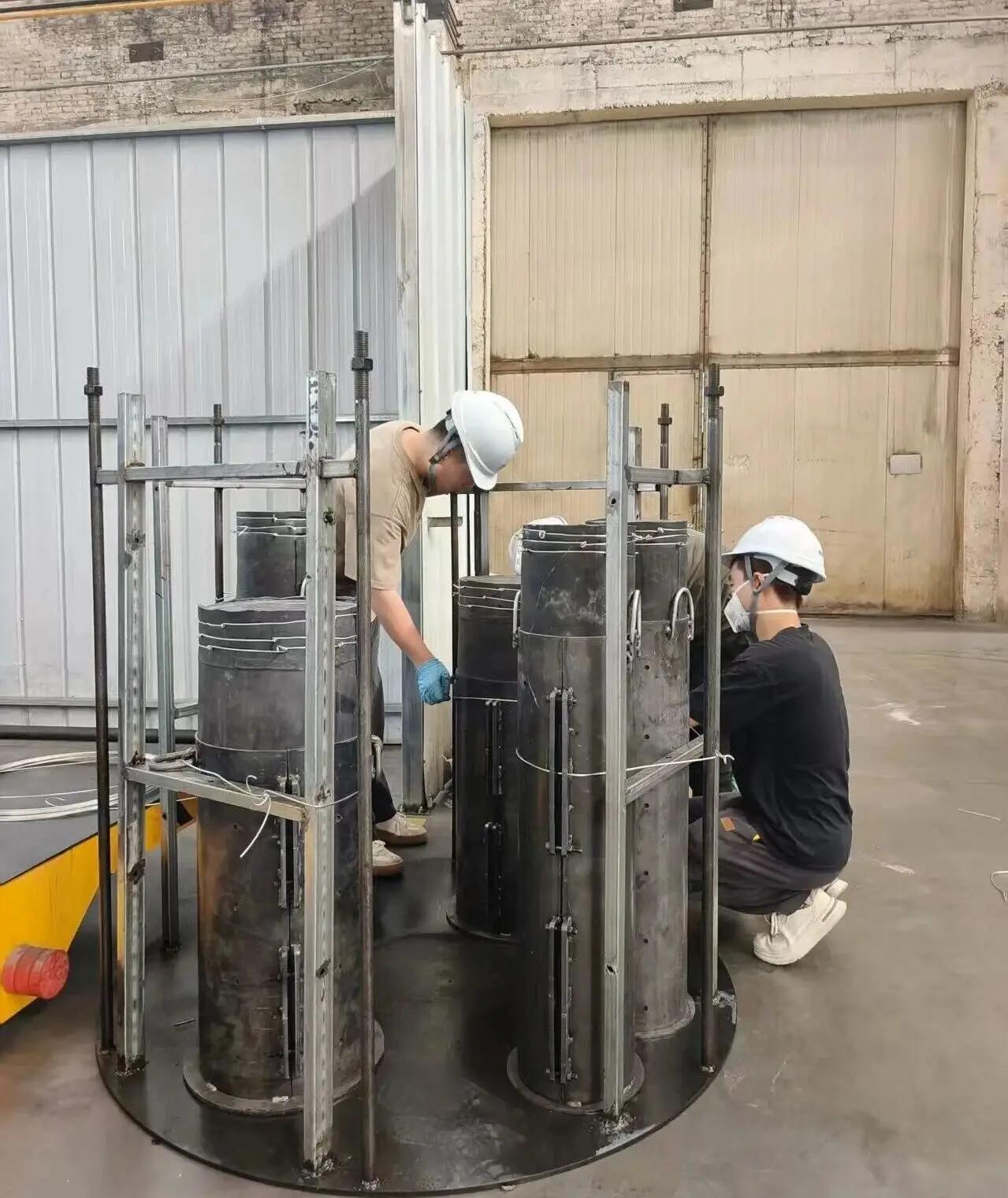 研發(fā)中心黨支部緊盯項(xiàng)目攻關(guān)各環(huán)節(jié),遇到大尺寸型材成型不穩(wěn)定、燒結(jié)參數(shù)難把控等“卡脖子”問題,第一時(shí)間組織專家開展專題研討會(huì),黨員骨干帶頭亮思路、獻(xiàn)方案。辦公桌上攤著圖紙報(bào)表,白板寫滿公式,這是該團(tuán)隊(duì)無數(shù)次交流的場景。“作為黨員,必須啃下硬骨頭。”實(shí)驗(yàn)室里,青年黨員汪澤瑾已連續(xù)工作十余個(gè)小時(shí),反復(fù)調(diào)試配方,筆記本上原料配比、燒結(jié)溫度記錄密密麻麻,鉛筆標(biāo)注的修改痕跡層層疊疊。生產(chǎn)車間內(nèi),“黨員先鋒崗”——職工趙永喆穿梭在設(shè)備間,輪班值守生產(chǎn)線,緊盯擠壓過程細(xì)節(jié),汗珠浸透工裝也渾然不覺。
