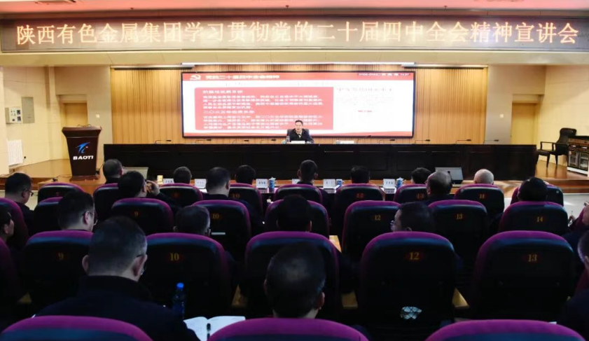 11月25日,陜西有色金屬集團(tuán)黨委副書記、董事、總經(jīng)理莫勇到寶鈦集團(tuán)宣講黨的二十屆四中全會(huì)精神并調(diào)研。寶鈦集團(tuán)黨委書記、董事長(zhǎng)王儉主持宣講會(huì)并陪同調(diào)研。