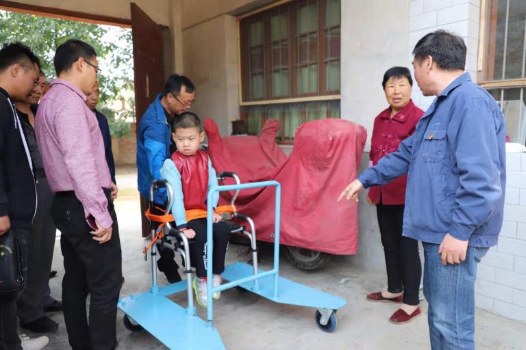 座談會后,一行人來到包聯(lián)貧困戶李海軍的家中,該戶家中9歲的孩子患有唐氏綜合癥不能獨(dú)立行走,讓這個(gè)貧困的家庭雪上加霜。駐村干部呂金輝早早發(fā)現(xiàn)了這一點(diǎn),他利用休假回單位期間,特地為患病兒童制作了一輛“代步車”,此次連同慰問品一起送到了貧困戶李海軍家中,并現(xiàn)場為患病孩子做了“代步車”操作演示,樸實(shí)的村民激動的熱淚盈眶,連連感謝。