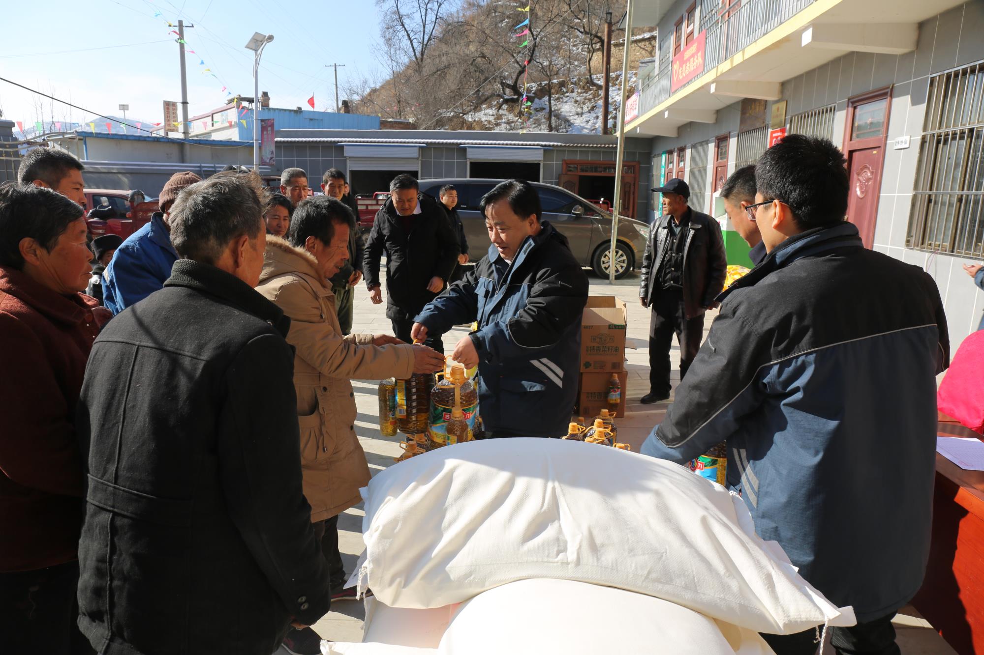 公司黨委慰問劉家坬村貧困村民,向村民送上慰問品米、面、油