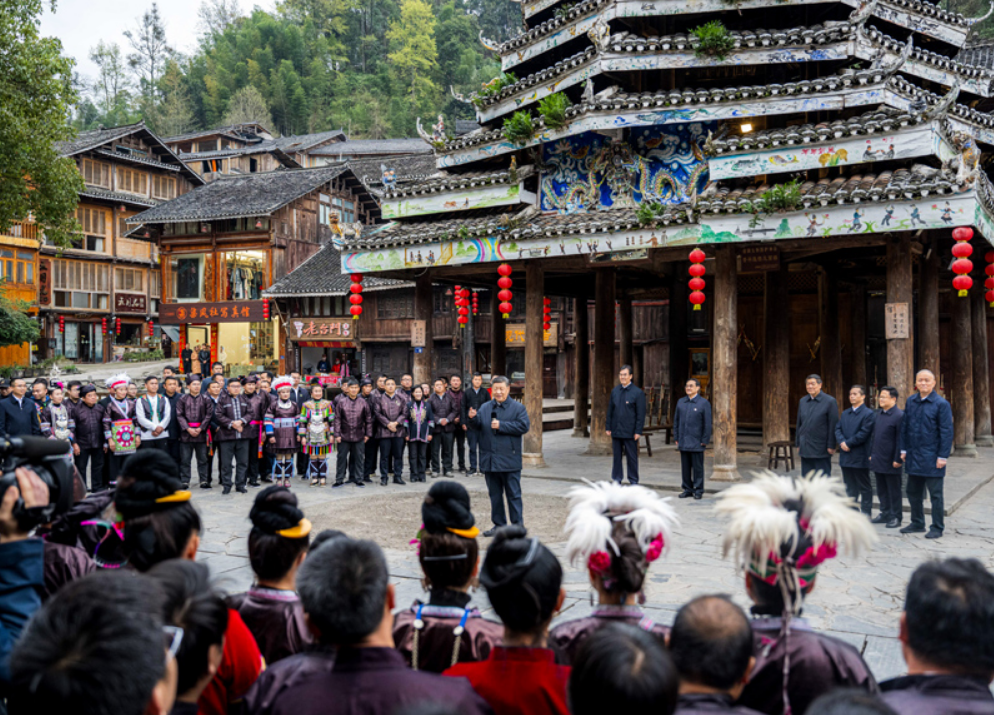 17日下午,習(xí)近平來到黔東南州黎平縣肇興侗寨考察。寨門口,身著民族盛裝的村民唱起侗族大歌歡迎總書記。習(xí)近平饒有興致地聽取侗族大歌的藝術(shù)起源、曲調(diào)特點(diǎn)、演唱形式等方面介紹。隨后,沿著村寨路道察看侗寨風(fēng)貌和旅游商鋪,不時駐足與店主、游客、村民互動交談。在侗族文化展示中心,他詳細(xì)了解侗族歷史、風(fēng)俗和服飾、建筑等特色文化保護(hù)傳承情況。在侗鄉(xiāng)特色產(chǎn)業(yè)基地,他觀看蠟染工藝流程,對蠟染合作社堅持顧客至上、質(zhì)量第一的運(yùn)營理念給予肯定。習(xí)近平指出,少數(shù)民族文化是中華文化不可或缺的組成部分,既要保護(hù)有形的村落、民居、特色建筑風(fēng)貌,傳承無形的非物質(zhì)文化遺產(chǎn),又要推動其創(chuàng)造性轉(zhuǎn)化、創(chuàng)新性發(fā)展,讓民族特色在利用中更加鮮亮,不斷煥發(fā)新的光彩。