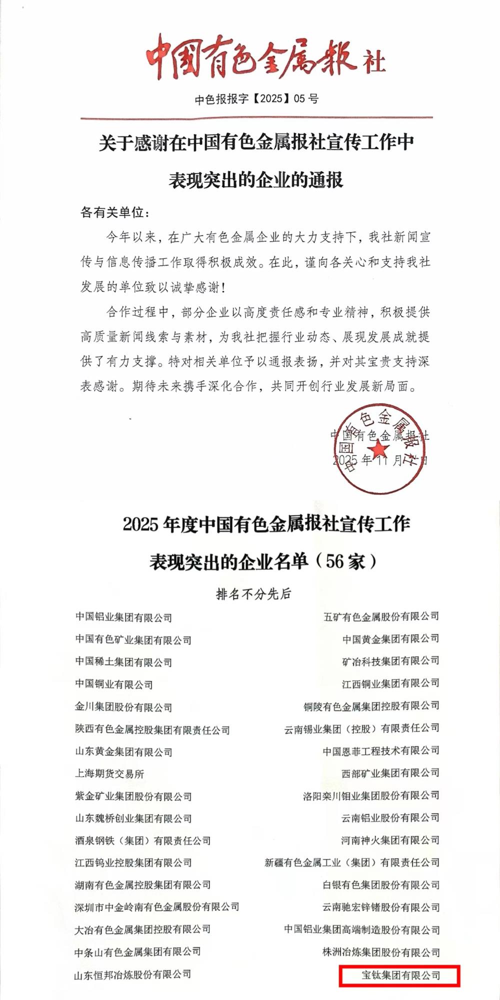 在近日召開的中國有色金屬報社2025年宣傳工作會議上,寶鈦集團(tuán)被評為宣傳工作表現(xiàn)突出企業(yè),寶鈦集團(tuán)文化新聞中心王丹被評為宣傳工作表現(xiàn)突出個人,獲得通報表揚(yáng)。