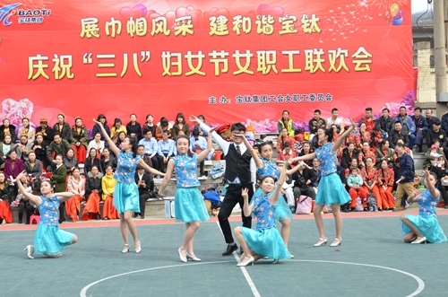 鈦城春意鬧,桃花灼灼開(kāi)。3月7日下午,寶鈦集團(tuán)老區(qū)燈光球場(chǎng)上又回蕩起了動(dòng)人的歌聲、歡快的音樂(lè),來(lái)自寶鈦各基層分會(huì)的500余名女職工歡聚一堂,以自編自導(dǎo)自演的大聯(lián)歡形式共同慶祝第107個(gè)“國(guó)際勞動(dòng)?jì)D女節(jié)”的到來(lái)。公司工會(huì)主席、紀(jì)委書記白林讓,副總經(jīng)理丁忠杰,公司職工文化體育活動(dòng)領(lǐng)導(dǎo)小組成員、各分會(huì)主席觀看表演。