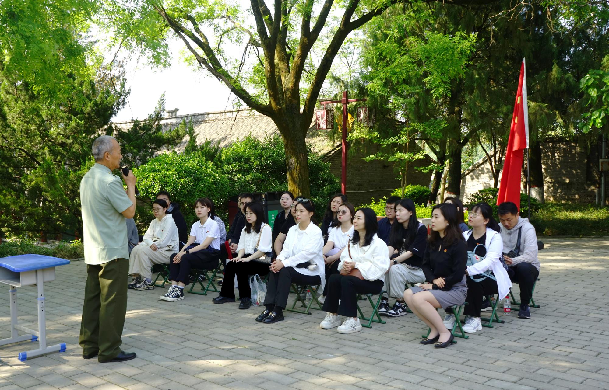 在起義舊址的大槐樹下,參加過中越邊境自衛(wèi)反擊戰(zhàn)的老兵陳乾明老師為青年們授課,飽含感情的講述將大家?guī)Щ貥屃謴椨甑膽?zhàn)場,帶回硝煙四起的年代,也更讓青年們深切體悟到,我們習以為常的和平盛世,是千千萬萬保家衛(wèi)國的戰(zhàn)士負重前行換來的,而青年的使命,正是不辜負犧牲、不辜負厚望,為中華民族的偉大復興接續(xù)奮斗。